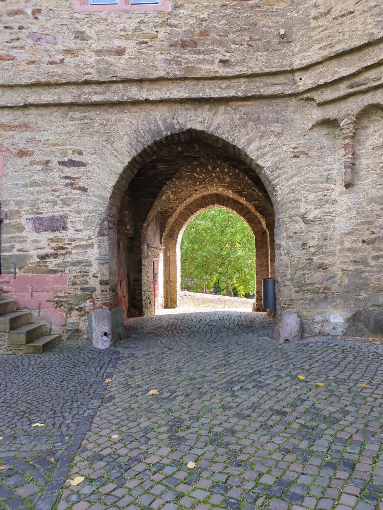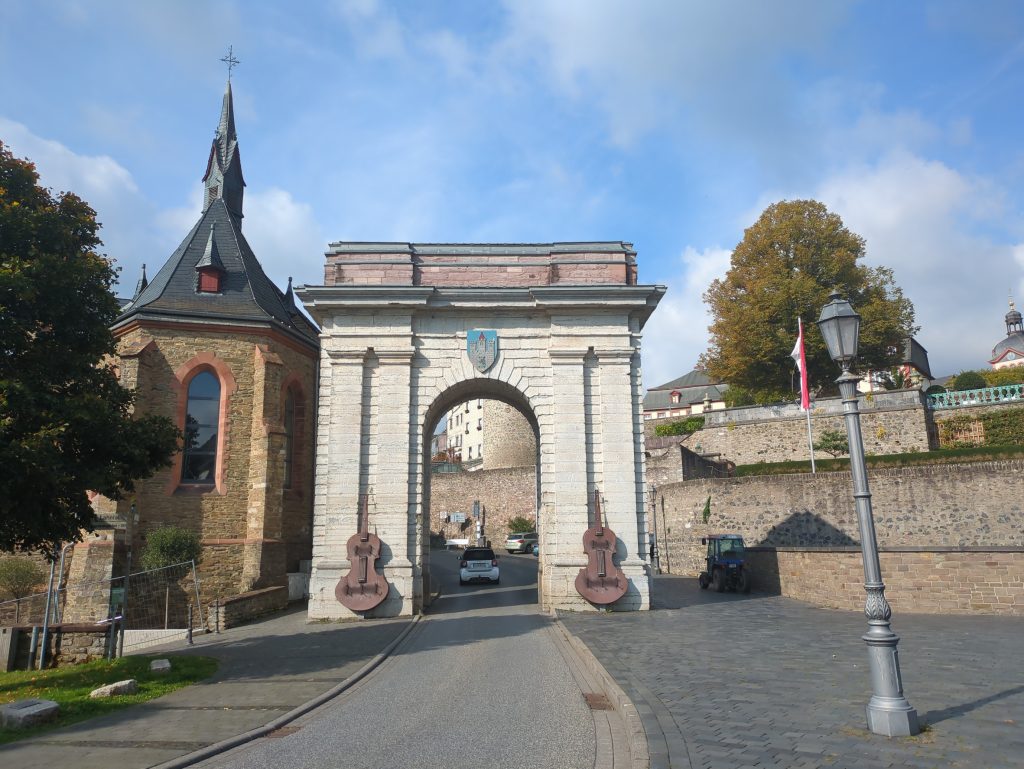 Dieses Tor führt in die Innenstadt von Weilburg. Interessant ist das Kirchlein daneben. Das war in seiner Wechselvollen Geschichte