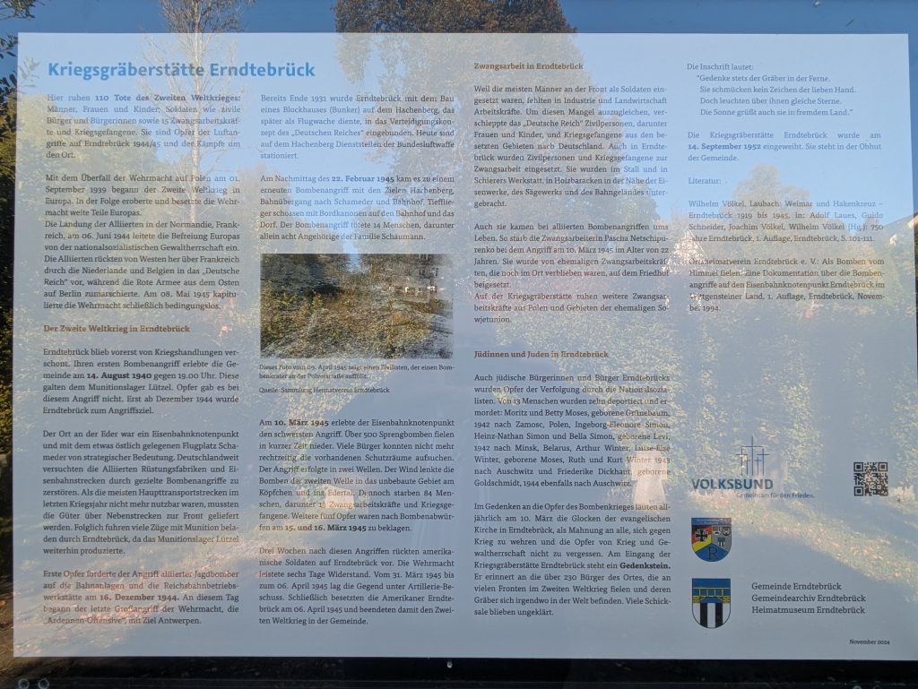 Ich hatte noch Zeit. Elke und Uli haben mich erst um 18.00 Uhr erwartet. So suchte ich mir Interessantes auf der Strecke aus. In Erndtebrück gab es einen Adventure-Lab-Cache, der sofort mein Interesse weckte. "Erinnerungen an den zweiten Weltkrieg". Ich war überrascht, wie sehr sich dieser Ort durch Gedenktafeln, Stolpersteine, Denkmäler mit dem zweiten Weltkrieg auseinander setzte. Erndtebrück war ein wichtiger Ort an der Eisenbahn. Dementsprechend heftig waren alliierte Bombenangriffe.