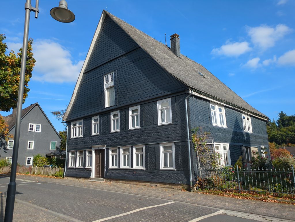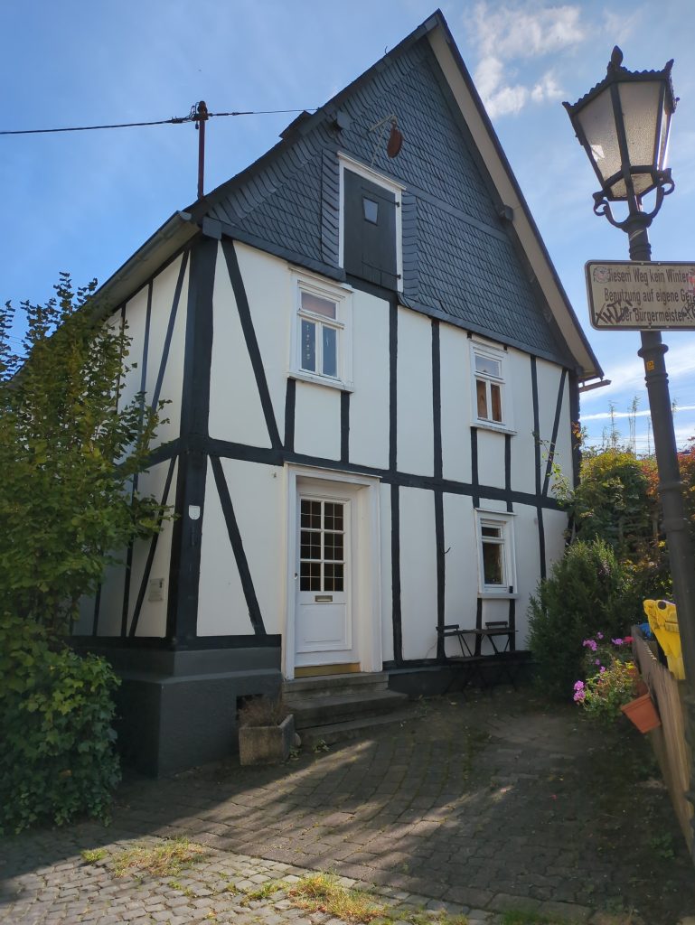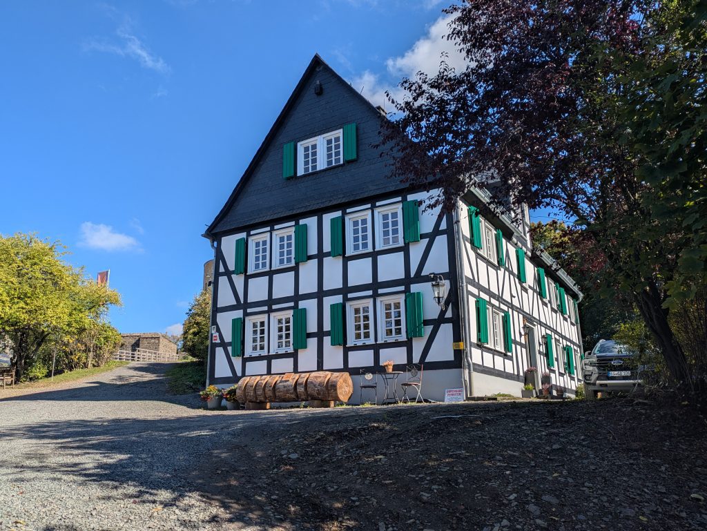 Für das Sauerland typisches Fachwerkhaus direkt unterhalb der Ruine. Der Turm spickt noch links am Haus hervor.