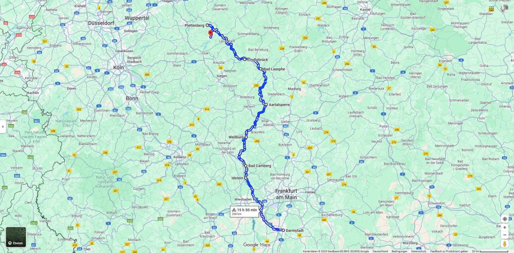 Grob skizziert, wollte ich meine Enkeltochter in der Nähe von Darmstadt besuchen und von dort aus nach Plettenberg fahren. Dort leben zwei Geocacher, die wir vor Jahren auf Mallorca bei einem Geocacher-Treffen kennen gelernt haben.